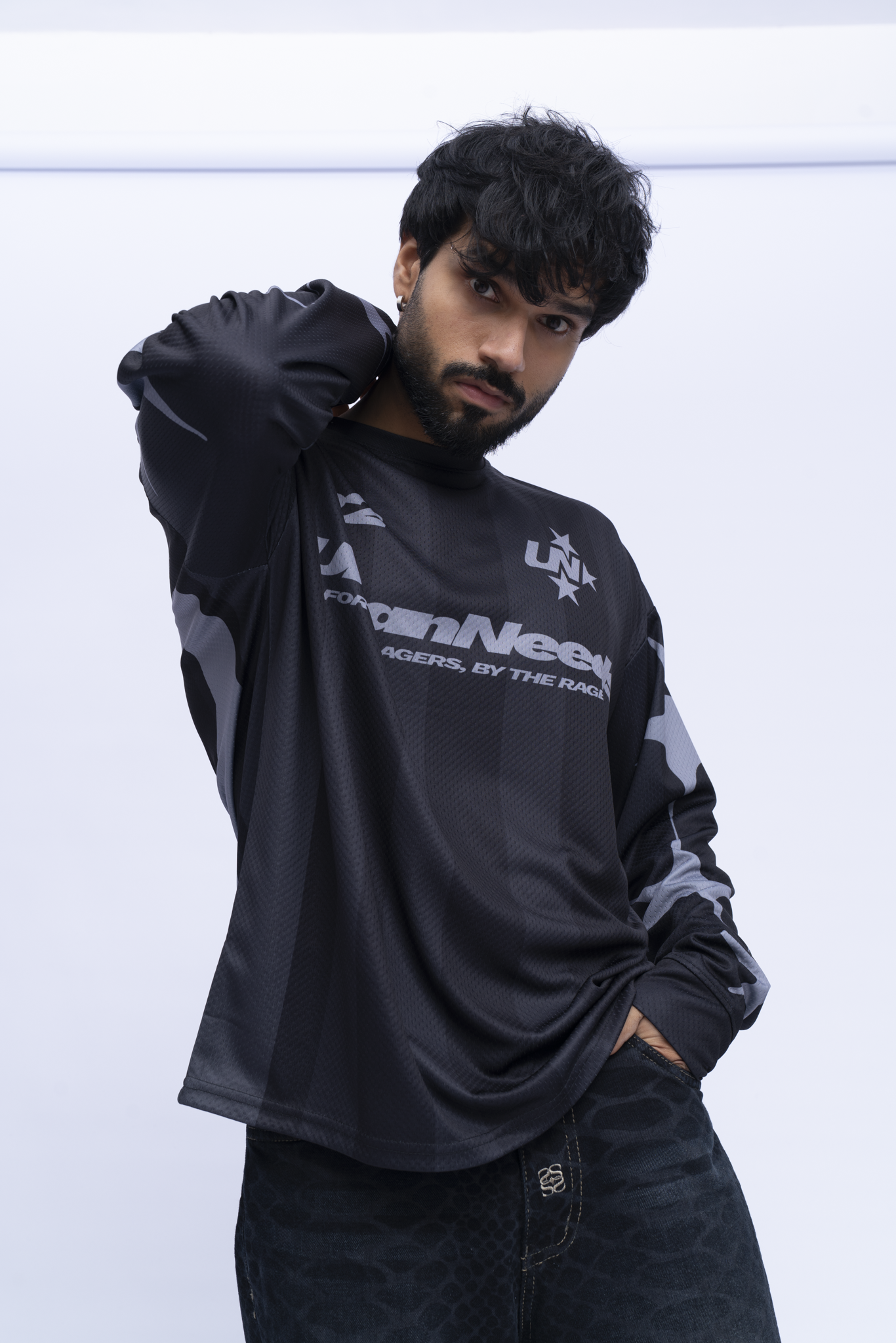 The Rager Long Sleeve Jersey in black is cut oversized and dialed down in attitude, turned up in presence. Sharp, understated, and built to move—this one thrives under city lights.